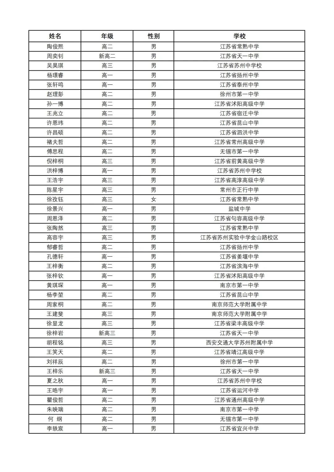 江苏省数学奥赛省队入选名单