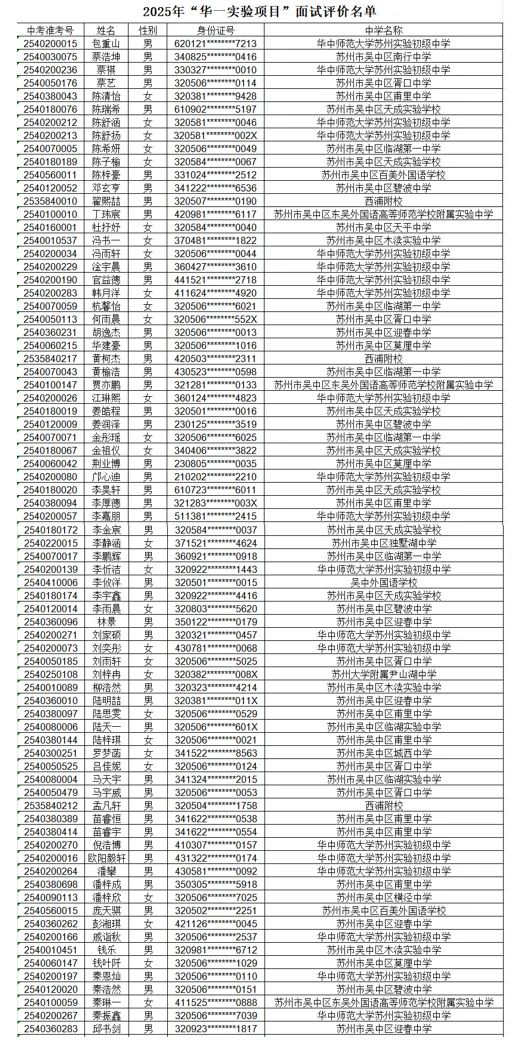 学校对自主招生平台上“华一实验项目”考生报名表和递交的相关审核材料进行了认真审核,汇总了符合条件的面试评价名单,并上报苏州市教育考试院再次审核,最终确定参加2025年“华一实验项目”面试评价名单,现公示如下: