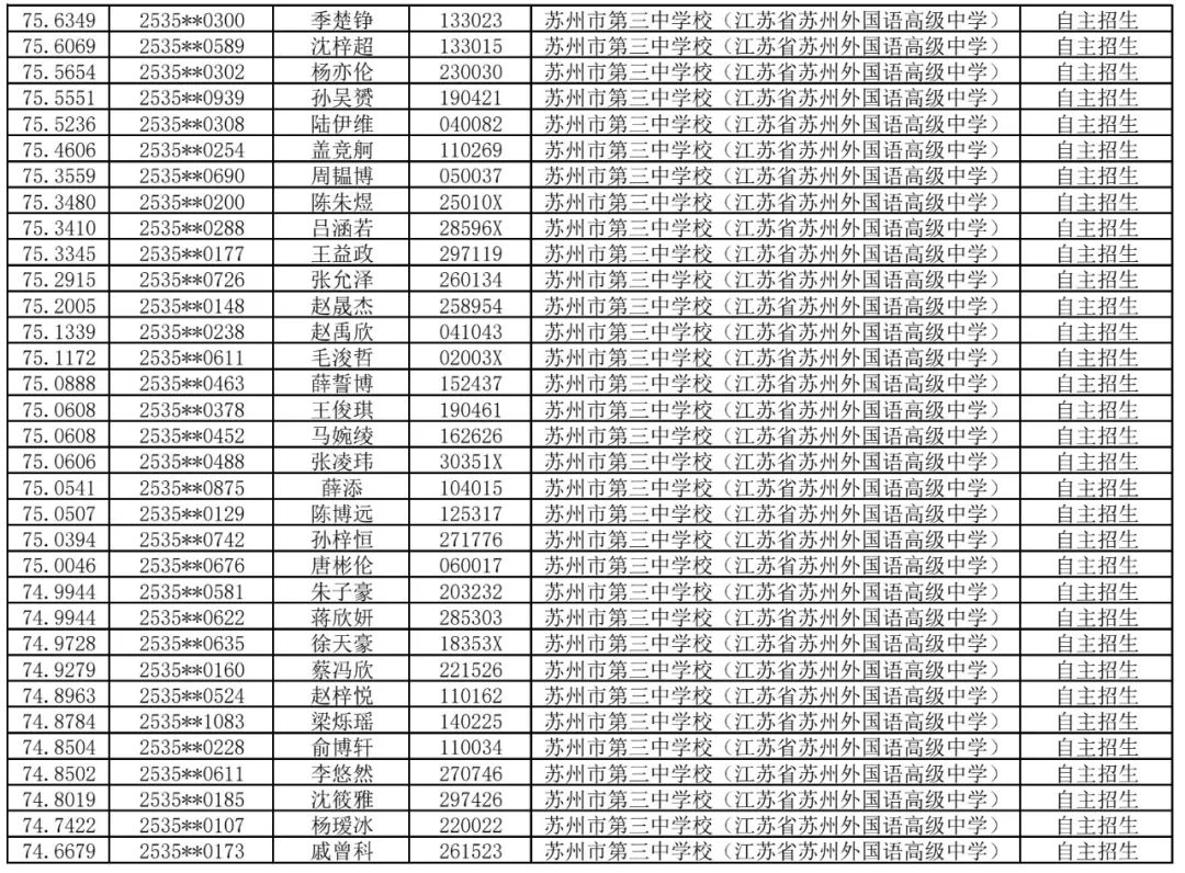 根据《关于做好 2025 年苏州市区普通高中学校自主招生工作的通知》(苏教基〔2025〕10 号)文件要求,现将参考学生综合成绩公布如下。(中考成绩未达到自主招生最低控制分数线的考生,或者已被此前批次录取的学生,不再反馈综合成绩。)
