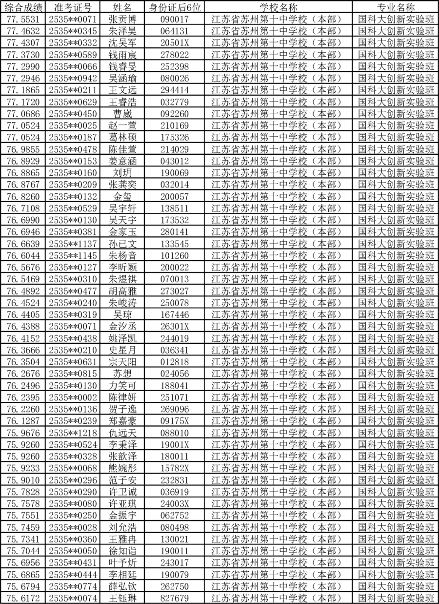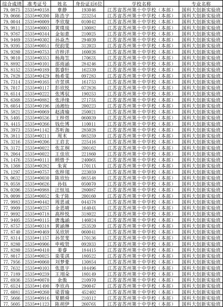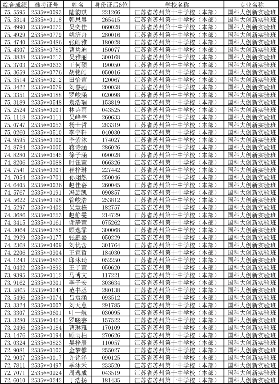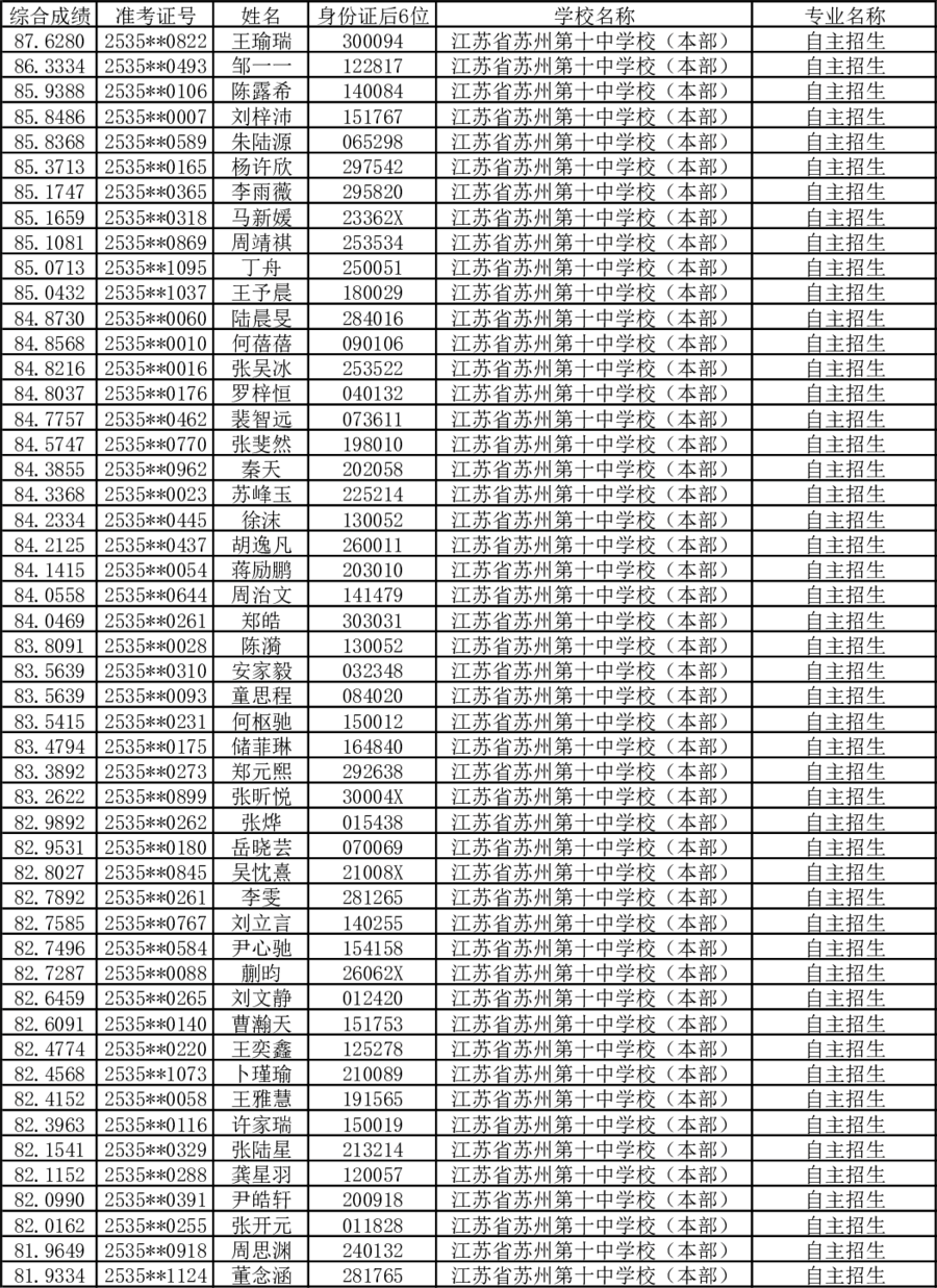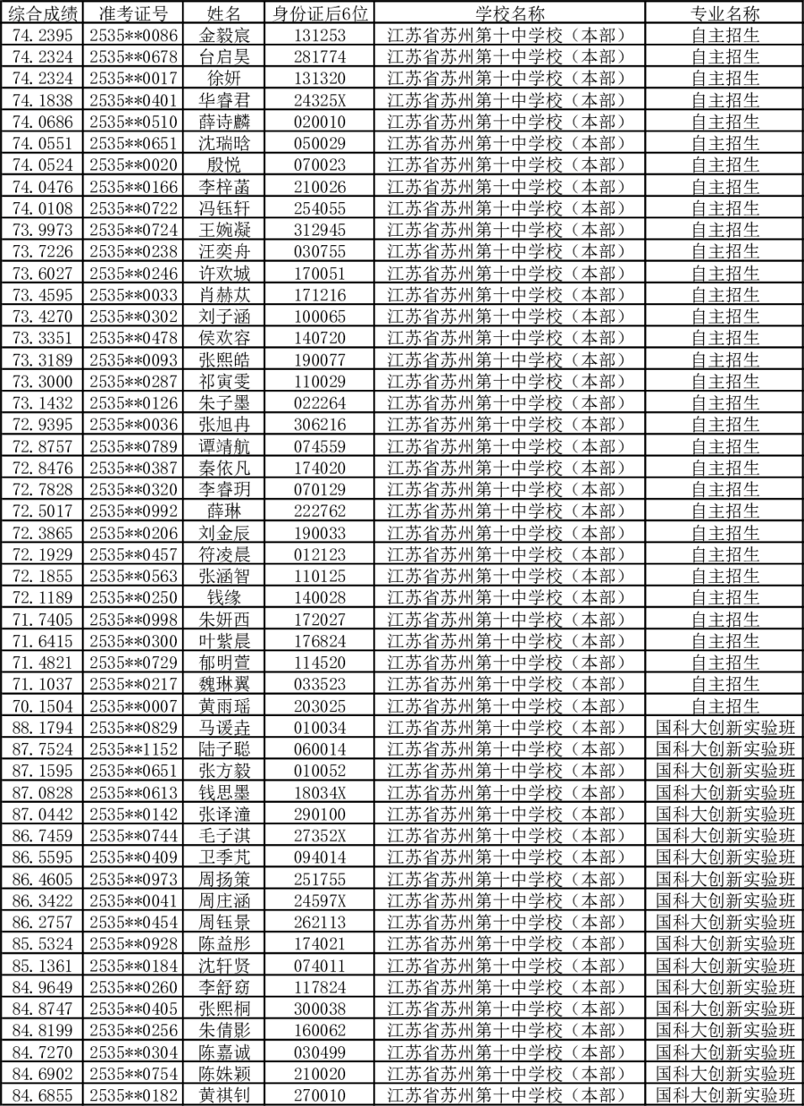 - 92023年江苏省苏州第十中学(本部)(金阊校区)自主招生录取名单公示