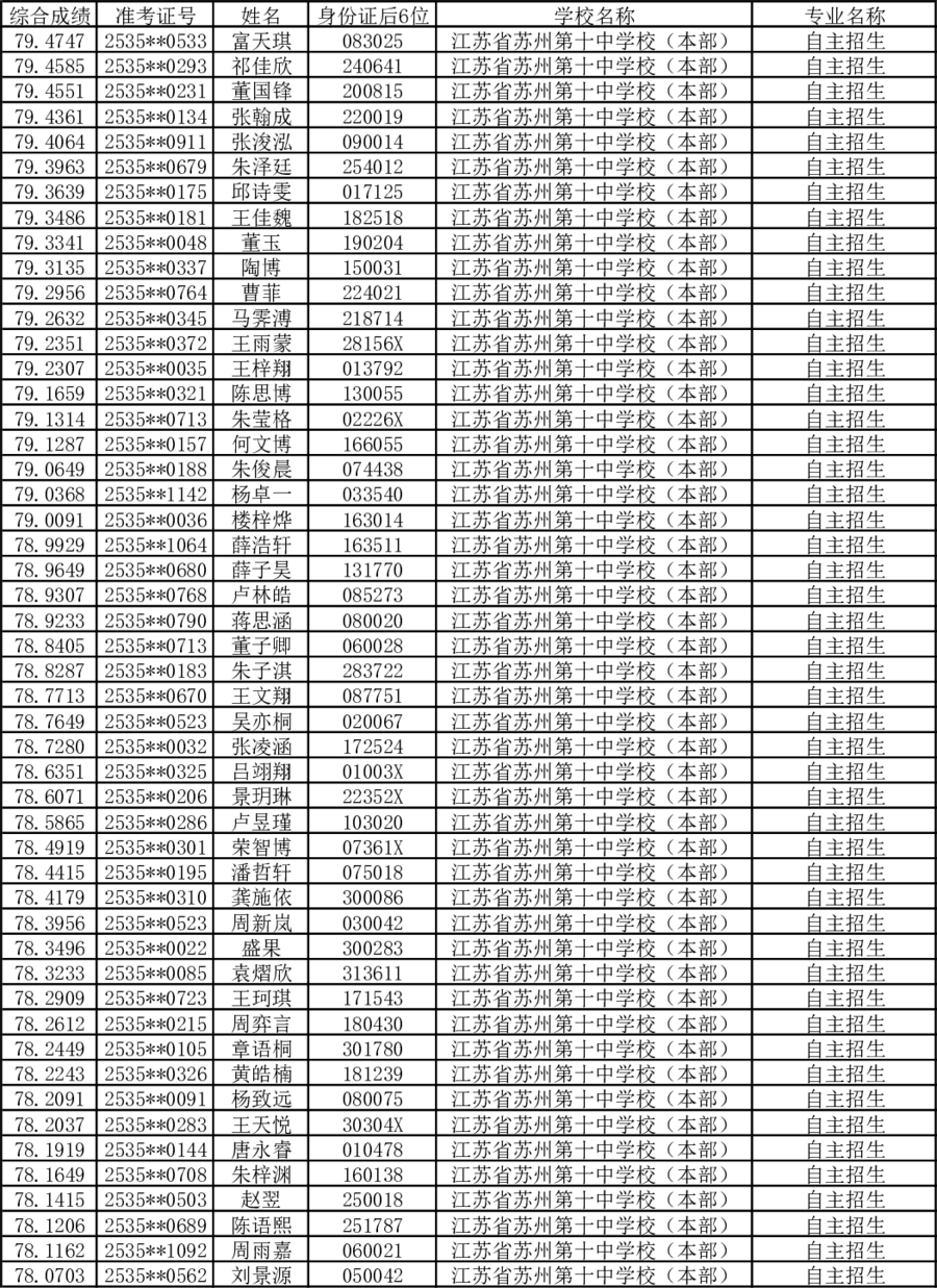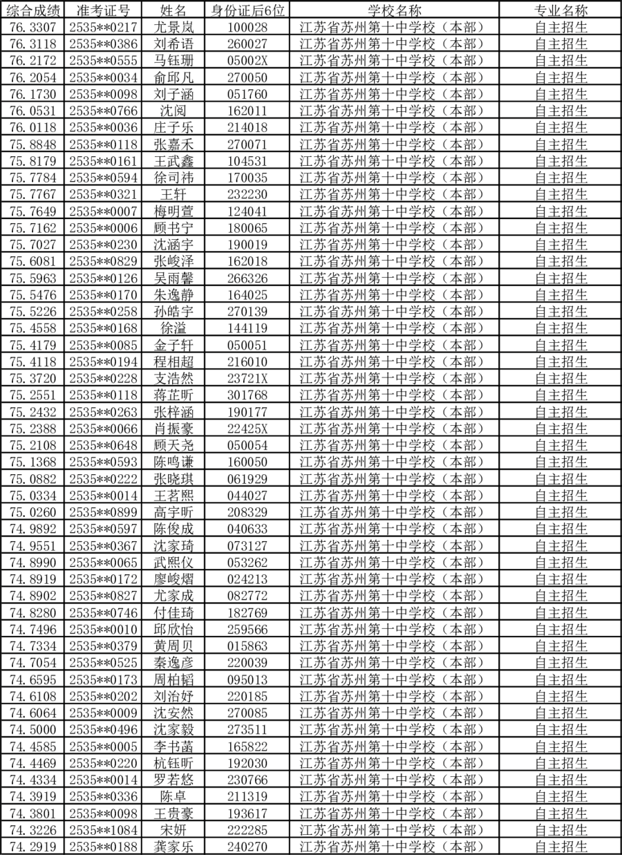 苏州第十中学校2025年自主招生考生综合成绩公示!