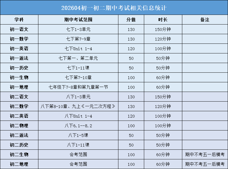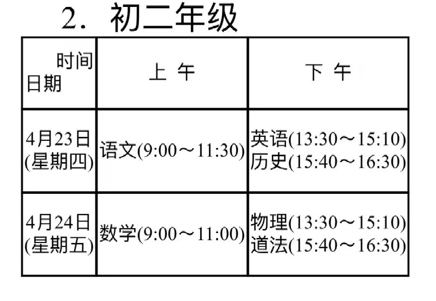 初二语数外物统考,道法、历史学校自行安排,生物、地理5月7日进行模拟考试;