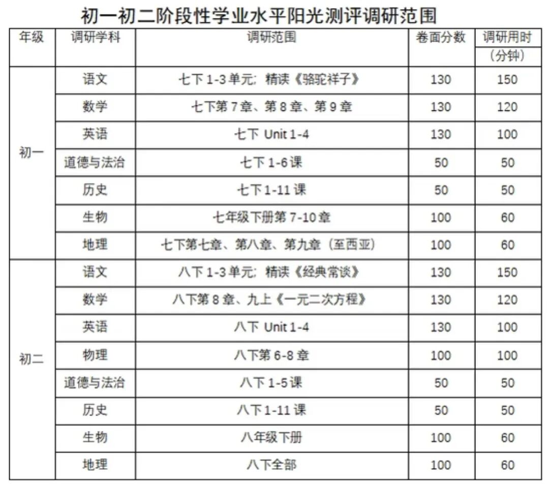 初一语数外统考,生物、地理、道法、历史,学校自行安排;