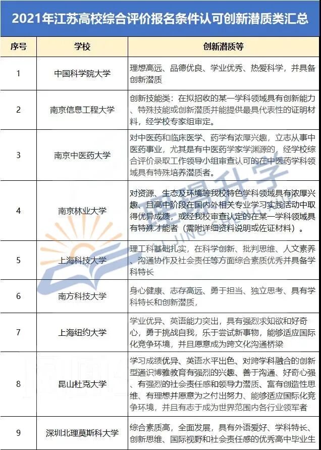 华南理工大学 选拔身心健康、综合素质高、符合江苏省2021年普通高等学校招生统一考试报名条件的优秀高中毕业生(含往届生)。考生须同时具备以下条件: (一)考生高考投档成绩(含政策加分)须达到江苏省相应特殊类型招生控制线。 (二)普通高中学业水平考试6科目(思想政治、历史、地理、物理、化学、生物)合格性考试成绩全部达到合格。 招生专业主要采用英语授课,非英语语种考生须慎重报考。 北京外国语大学 考生应同时具备以下条件: 1.具有坚定的爱国主义信念,品学兼优、诚实守信、遵纪守法; 2.高三第一学期期末(或最近一次模考)成绩在年级同科类排名前10%以内,并且语文和外语成绩均在同科类排名的前10%以内(我校生源基地校和省级示范校可适当放宽排名限制); 3.外语学习能力突出,具有浓厚的外语学习兴趣;对国别区域和国际政治、经济、文化发展趋势有浓厚兴趣; 4.高中阶段体能测试合格; 5.符合《2021年普通高等学校招生工作规定》中的高考报名条件。 中国科学院大学 理想高远、品德优良、学业优秀、热爱科学,并具备创新潜质的理科或不分科高中毕业生。 南方科技大学 身心健康、志存高远、勇于担当、独立思考、具有学科特长和创新潜质,参加2021年普通高等学校招生全国统一考试的高中理科毕业生(新高考省份须选考物理)。 上海科技大学 符合2021年上海科技大学所在招生省(市)高考报名条件的,理工科基础扎实,在科学创新、批判思维、人文素养、沟通协作及社会责任等方面综合素质优秀并具备学科特长的优秀高中毕业生均可报考我校。 香港中文大学(深圳) 符合以下条件的同学请登录香港中文大学(深圳)“综合评价招生报名系统”按照有关步骤进行报名: 1.具有2021年普通高等学校招生统一考试报名资格的优秀高中毕业生(含往届生); 2.由于香港中文大学(深圳)课程以英文授课为主,非英语语言考生请慎重报考; 3.10门学业水平合格性考试科目(不含体育与健康、艺术(音乐、美术)、通用技术、理科实验)成绩均须合格(或新高考改革前的往届学生学业水平必修科目均须合格,或C级及以上等级)。 上海纽约大学 上海纽约大学寻找的是学业优异、英语能力突出,具有强烈求知欲和好奇心,勇于挑战自我,乐于尝试新事物,能够适应国际化竞争环境,并且愿意成为跨文化沟通桥梁的优秀高中毕业生。 深圳北理莫斯科大学 参加2021年普通高等学校招生全国统一考试,综合素质高,全面发展,具有外语爱好、学科特长、创新思维、国际视野和社会责任感的优秀高中毕业生。