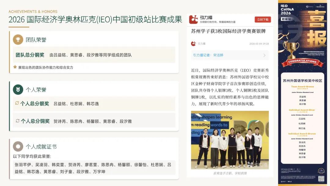 学院的前瞻性布局已初见成效,学员在2026年国际经济学奥林匹克(IEO)中国初级站比赛中斩获3枚银牌。学院正朝着完成NFLA基地认证、打造区域财商教育标杆的目标稳步迈进。