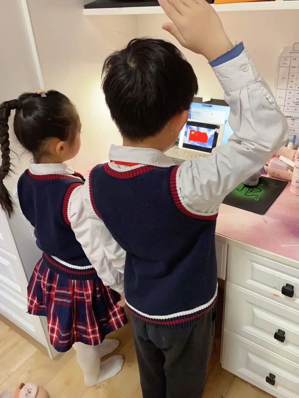 叶修琪和吴修玥这对姐妹,也有着许多暖心的瞬间。妹妹刚上一年级时,对陌生的校园充满了不安。每天早上,姐姐都会紧紧牵着她的手,穿过嘈杂的操场,走过长长的走廊,一直把她送到班级门口,用行动给妹妹满满的安全感。课间操时,妹妹总会仰着头,在人群中努力寻找姐姐的身影,那专注的眼神里,满是对姐姐的依赖。在妹妹即将加入中国少年先锋队的时候,作为大队委的姐姐,认真叮嘱妹妹要牢记少先队员的“六知六会一做”,还亲自示范如何行队礼、戴红领巾,将红领巾里的传承意义传递给妹妹。