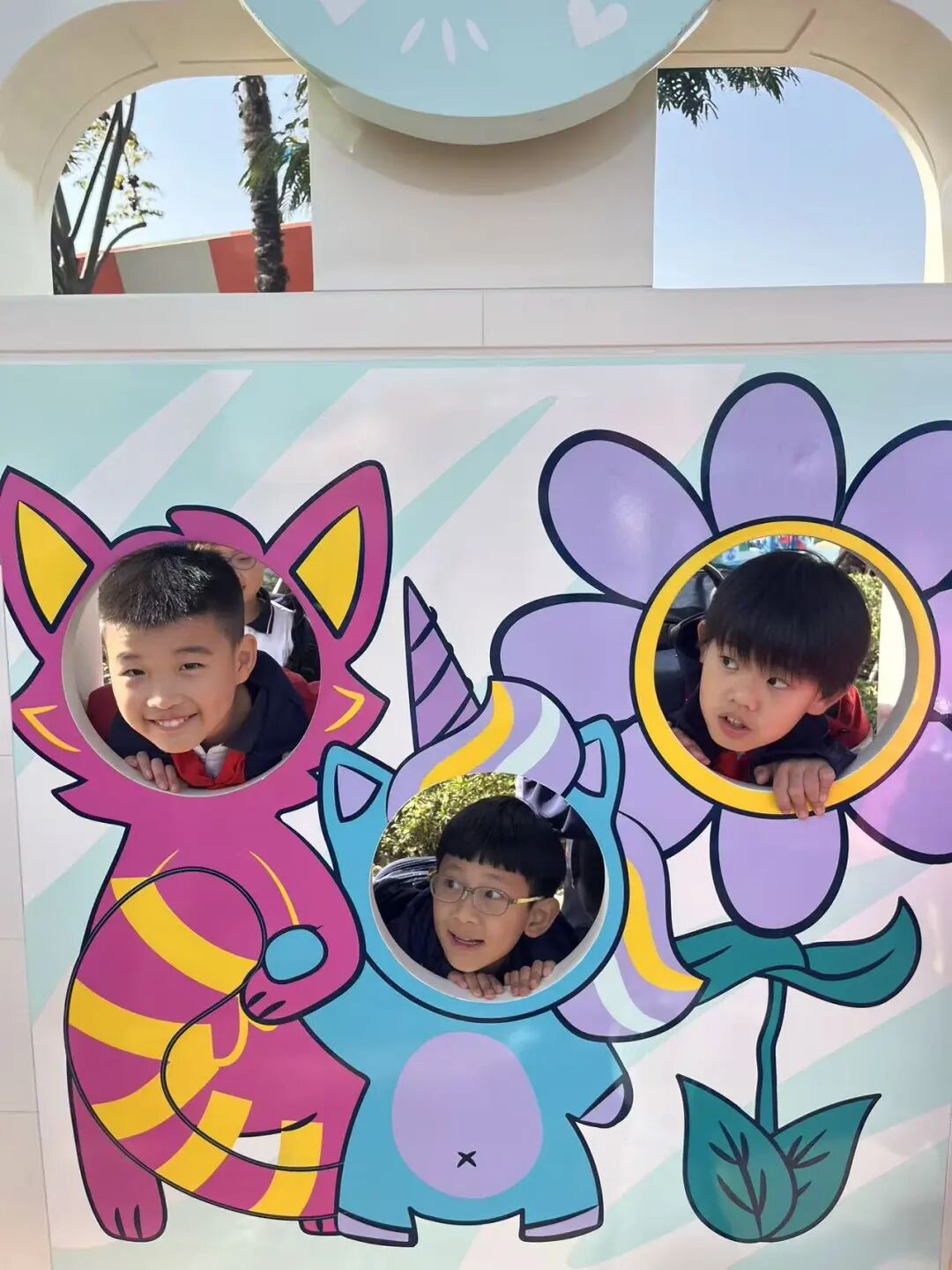 刚入园,同学们就钻进卡通造型打卡框——猫咪、独角兽、花朵的镂空里,笑眼弯弯成了乐园里最灵动的“积木零件”。