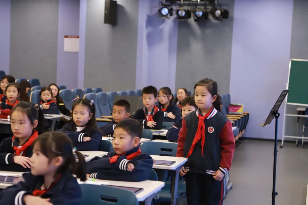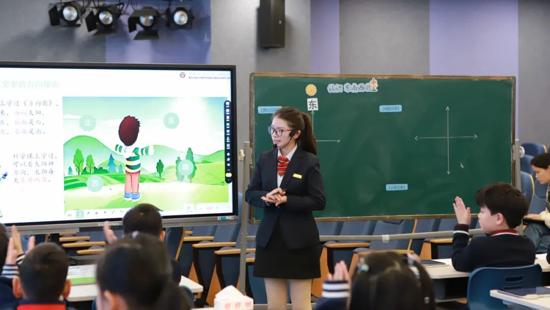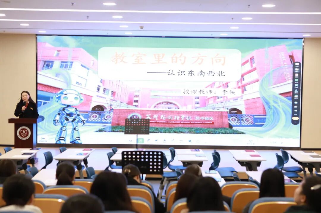 李侠老师以《生活中的方向》为题开展教学展示,课堂上,她践行学校“中外互通、文理互融”的办学特色,融合语文、科学等学科中与方向相关的知识讲解,并结合生活化情境创设与动手操作活动,引导学生在观察、实践中自主“发现”方向规律,通过由教室内方向辨识、到苏州姑苏区简易地图景点方位判断、再到世界东南西北格局方向认知的梯度设计,以多元化方式呈现学习成果,有效化解了方向知识的抽象性,实现了从认知到运用的进阶。